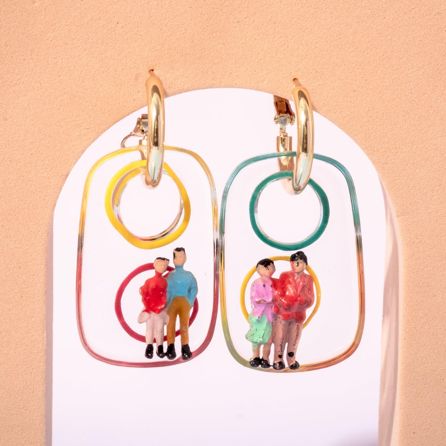 Our Tiny Luminary Love Hoop Earrings are real eye-catchers. They come in four bright colors and have fun heart and oval shapes. There's a little person shape right in the middle. These earrings are more than just a pretty accessory - they're a way to show that we're all connected. Plus, the hoop on top gives them a stylish finish. Brighten up your day, and your outfit, with these colorful earrings.