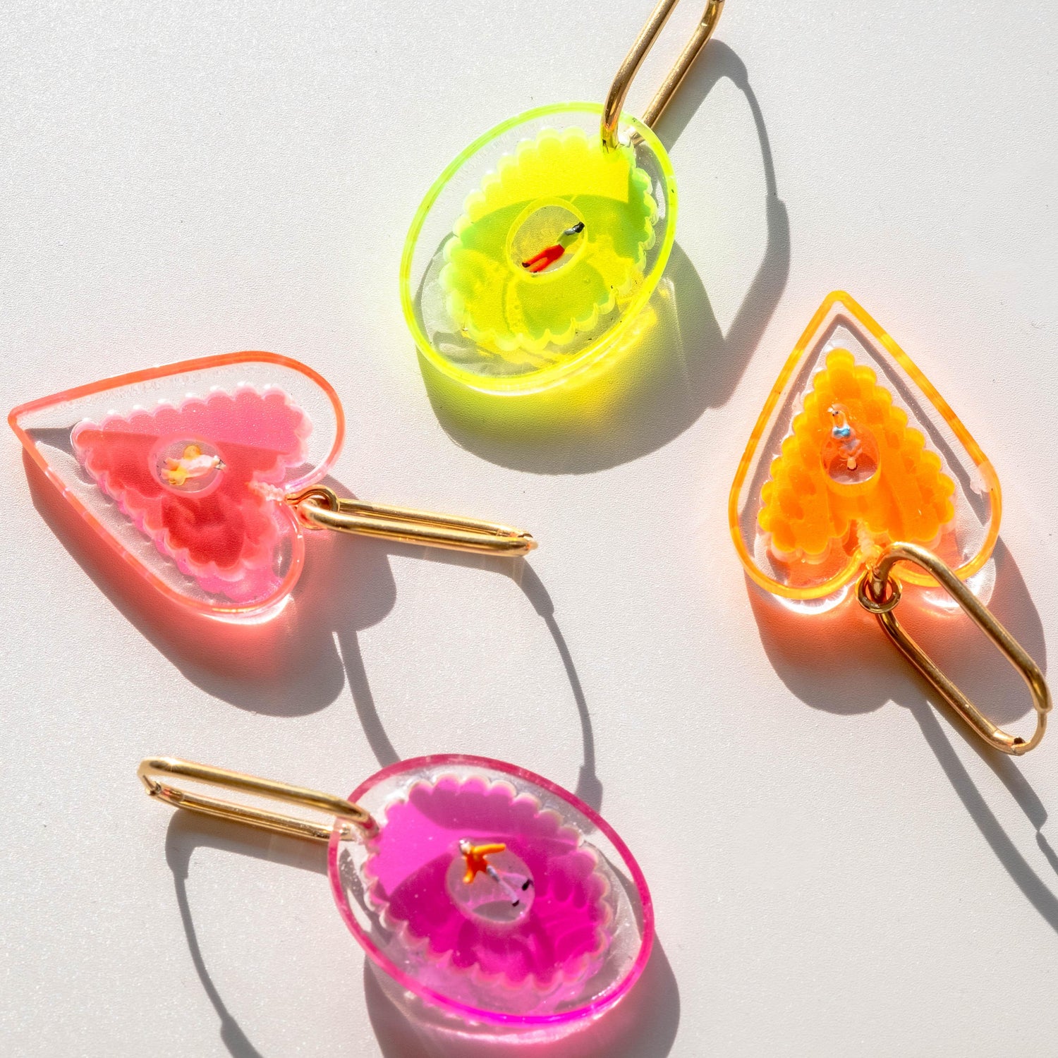 Our Tiny Luminary Love Hoop Earrings are real eye-catchers. They come in four bright colors and have fun heart and oval shapes. There's a little person shape right in the middle. These earrings are more than just a pretty accessory - they're a way to show that we're all connected. Plus, the hoop on top gives them a stylish finish. Brighten up your day, and your outfit, with these colorful earrings.